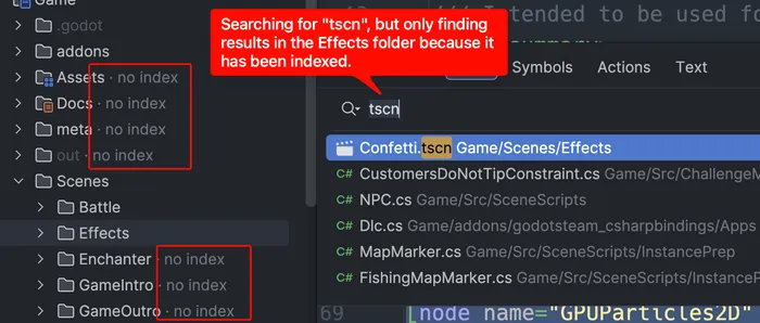 - Right-click the file (or containing folder) in the Explorer view and choose [Edit → Exclude] or [Tools → Stop Index] (depending on whether you’re in the files or solution view).