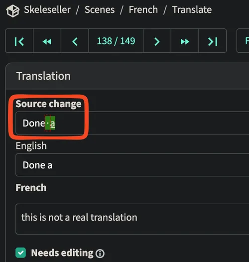 - As you can see, when I changed “Done” to “Done a” while already having a French translation, Weblate marks this as a “Source change” and shows the diff. However, it still does not retain the comments, history, or anything else.