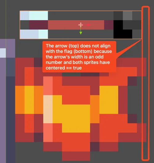 Section titled “Aligning sprites”One time, I ran into an issue where I was trying to align two sprites, but I could only get them within half a pixel of one another. This is because one sprite had an odd width and the other had an even width but both were set to centered: