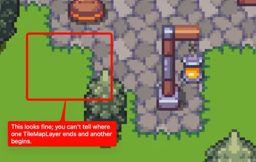 Section titled “Fading in layered TileMapLayers looks weird”In this screenshot, you can see the green boundary around the stone, but it’s supposed to be the same color as the surrounding tiles.